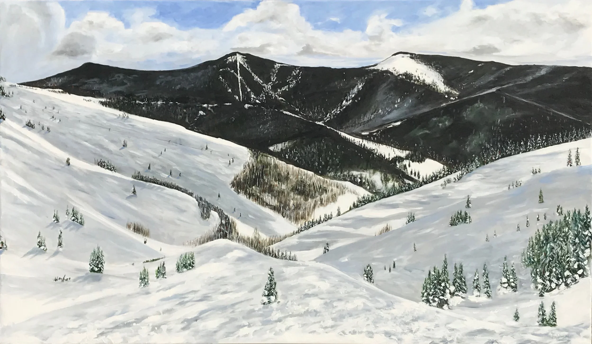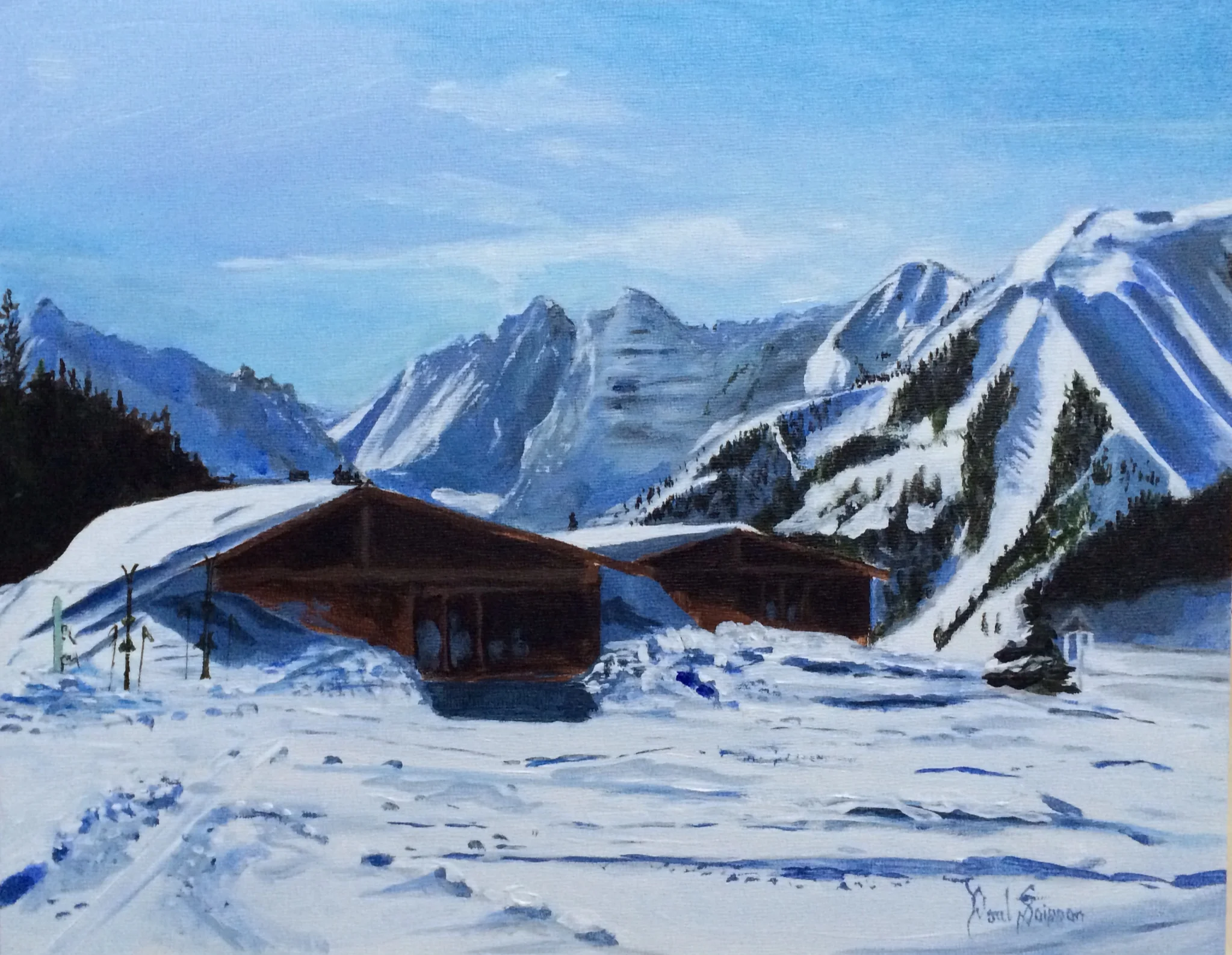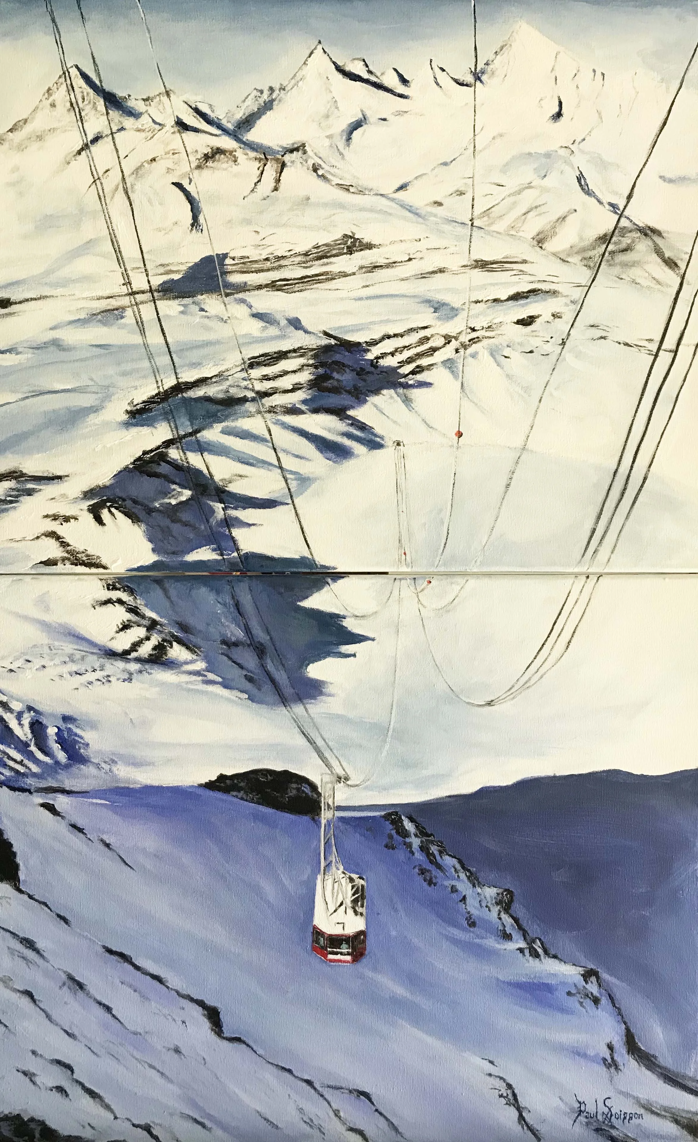 After skiing in Zermatt I began a painting of the tram approaching the summit. Then after some coaxing from my daughter added another canvas on top to show the whole view we saw.